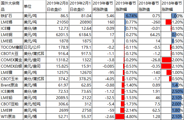 2019年春節(jié)期間,受對(duì)世界經(jīng)濟(jì)增長(zhǎng)放緩的擔(dān)憂大宗商品價(jià)格基本以小幅度下跌為主,其中尤以原油價(jià)格下跌為甚。