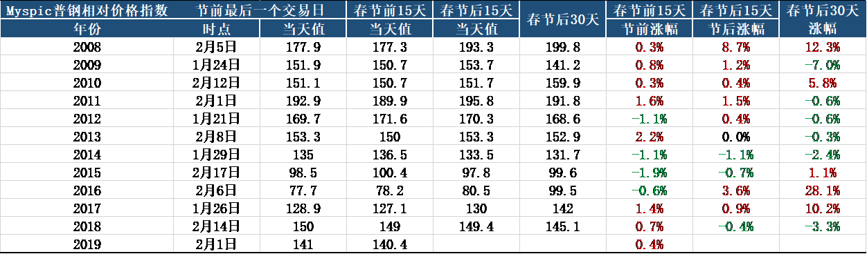 具體價(jià)格方面,從往年Myspic普鋼先對(duì)價(jià)格指數(shù)的春節(jié)前后對(duì)比來看,最近十年有70%的概率節(jié)日前后15日價(jià)格漲跌趨勢(shì)一致。2019年春節(jié)前15日鋼價(jià)指數(shù)累計(jì)小幅上漲0.4%,預(yù)計(jì)開門紅行情大概率出現(xiàn)。